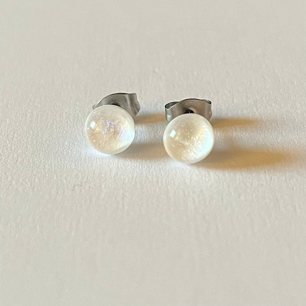 Made in a torch flame and carefully annealed in a kiln overnight to prevent any breakages these earrings would be perfect to complement an outfit or as a little gift to someone. The backs are Surgical Steel, a completely safe and hypo-allergenic metal. The steel backs are fused into the glass while it is still hot, so no glue is needed.